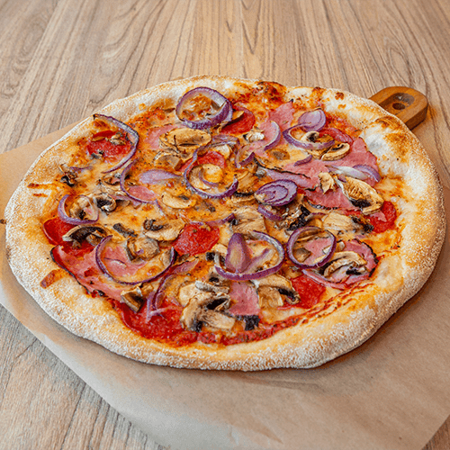 z sosem pomidorowym, serem mozarella, szynką, salami pepperoni, pieczarkami i cebulą czerwoną