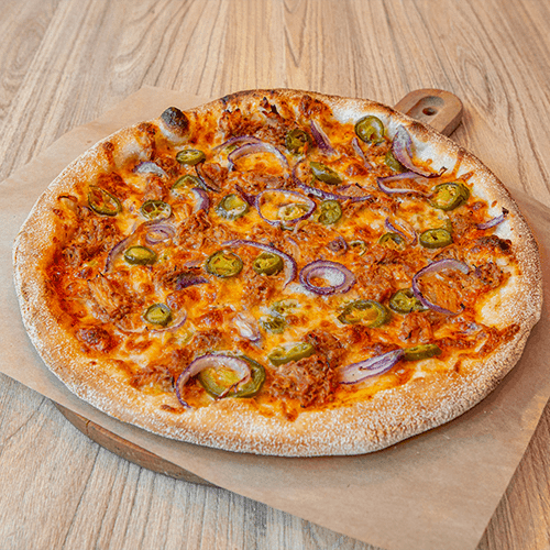 z sosem barbecue, serem mozzarella, boczkiem wędzonym, kurczakiem, cebulą i papryczkami jalapeno